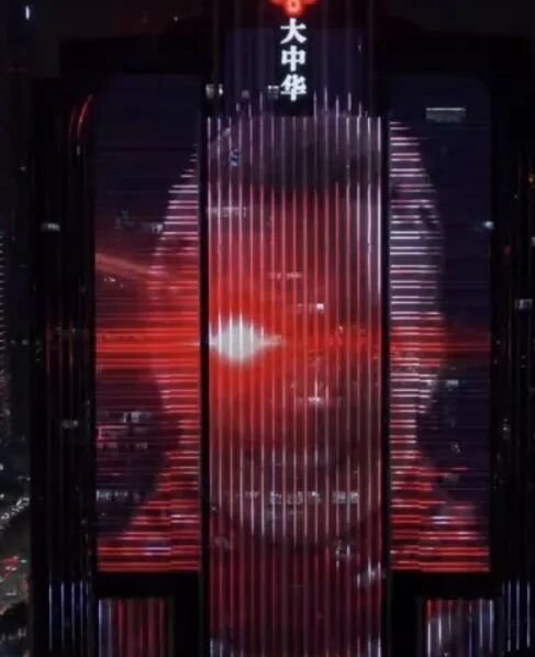 当游戏中以高精度狙击出名的Boss德穆兰的老脸,映射在大楼的玻璃幕墙上时,我猜现场观众都会觉得有点头疼。后面摇头晃脑的乌鲁鲁更是足以让人“吓哭了”,谁叫乌鲁鲁这个干员太适合堵桥,都怕他这一次要“堵港珠澳大桥”。